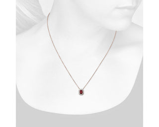 A 14k rose gold pendant with an emerald cut ruby and diamond halo (6x4mm)