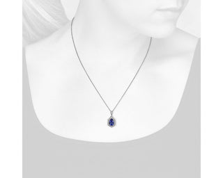 Double halo pendant in 14k white gold shaped like a pear set with tanzanite and diamonds