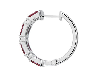 Alternating Ruby Baguette And Round Diamond Hoop Earrings In 14k White Gold