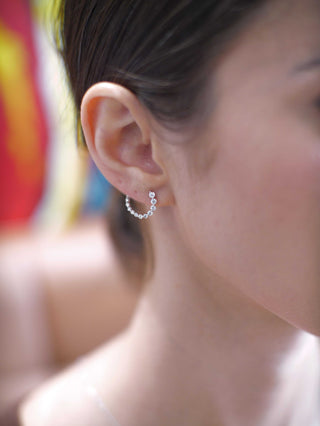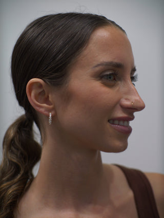 Huggies earrings are stylish, small hoop earrings designed to "hug" the earlobe closely, offering a chic and minimalist look. They often feature a hinge and clasp mechanism for easy wearing and secure fit. Made from various materials such as gold, silver, or stainless steel, and often adorned with gemstones or intricate designs, Huggies are versatile and perfect for everyday wear or special occasions. Their sleek and comfortable design makes them a favorite choice for those seeking a subtle yet elegant accessory.