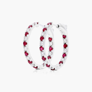 14K White Gold Inside Out Ruby And Diamond Round Hoops, 3/4 Inch Diameter.