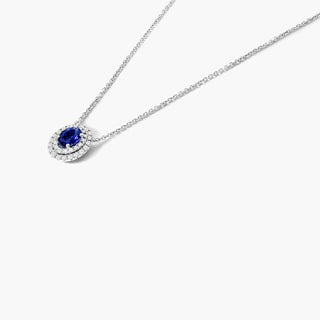 18K White Gold Oval Sapphire Double Diamond Halo Necklace